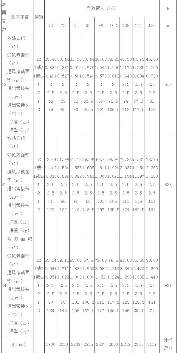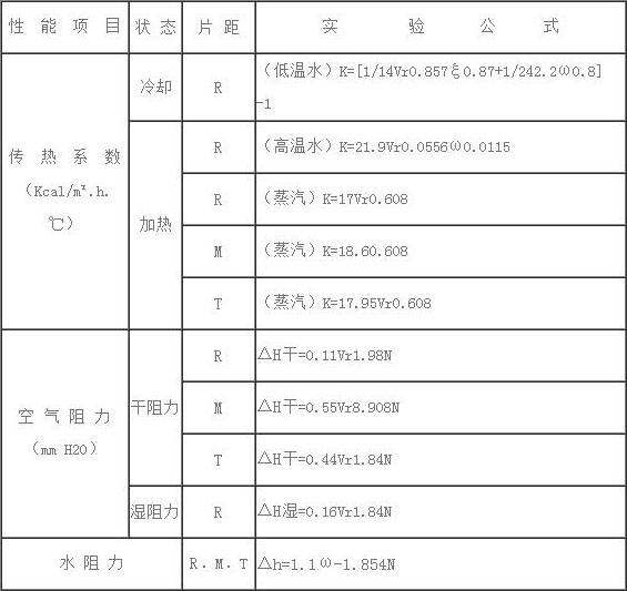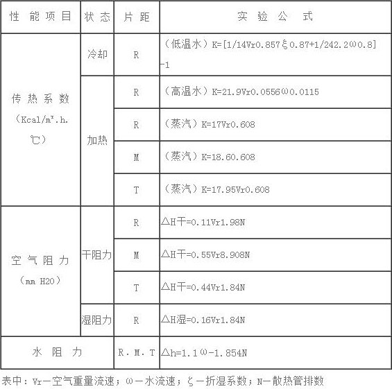 表中基本參數數據域不同排數,不同片距型空氣熱交換器換算式